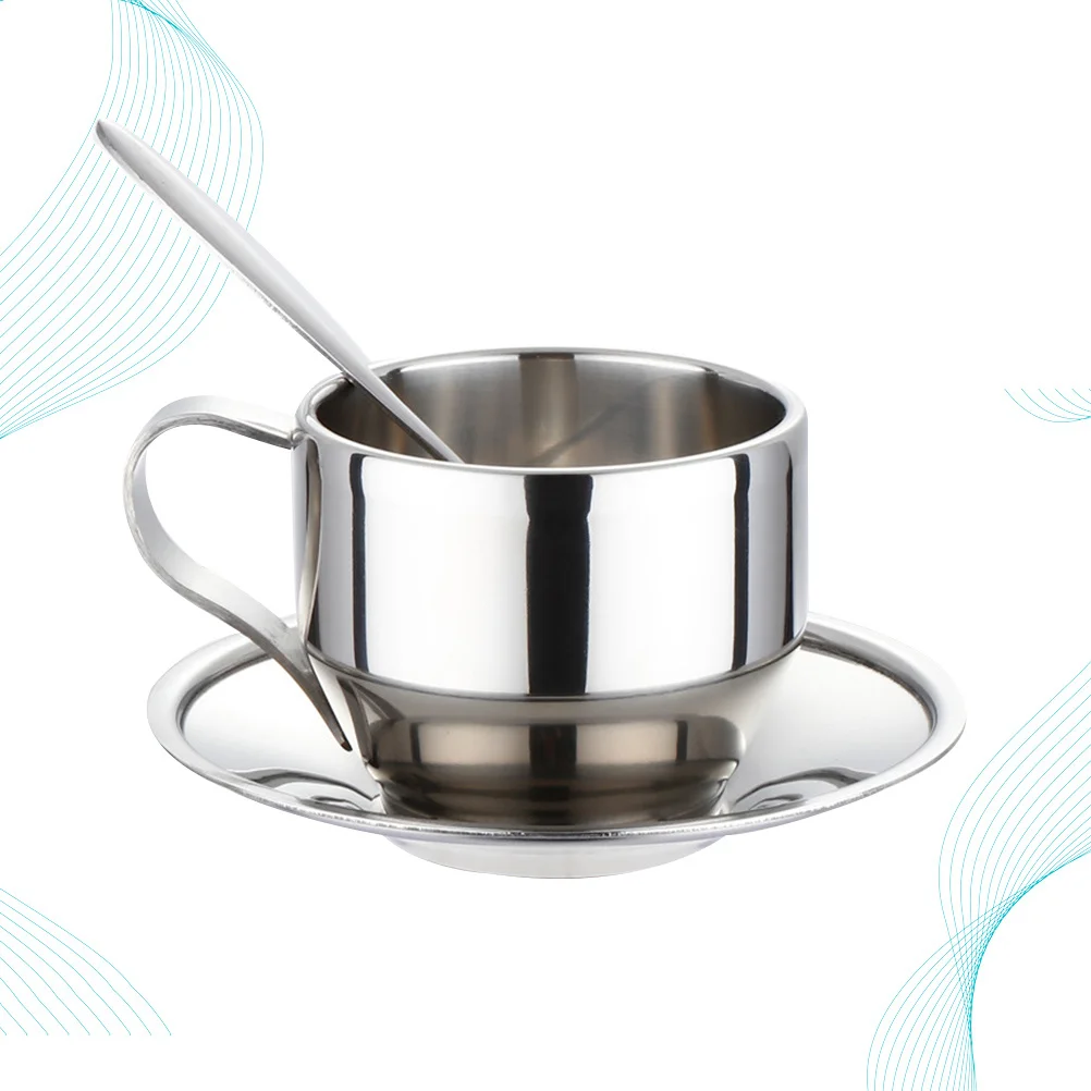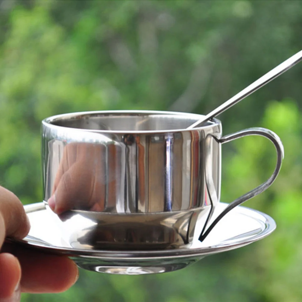 3Pcs Stainless Steel Tea Cup Coffee Cup Set Plate Spoon Ergonomic Handle Safe Material Perfect for Daily Coffee Tea