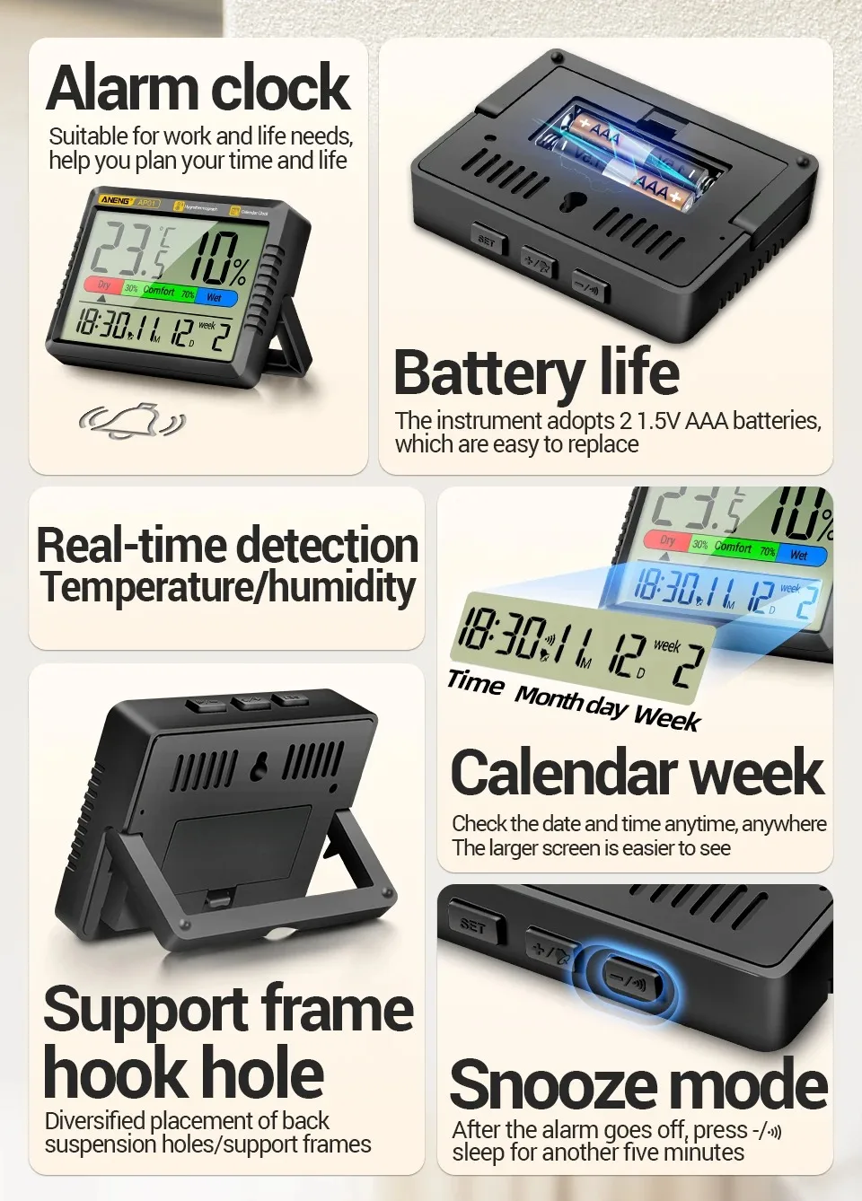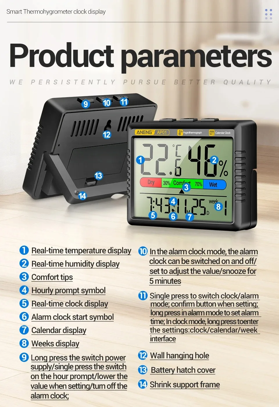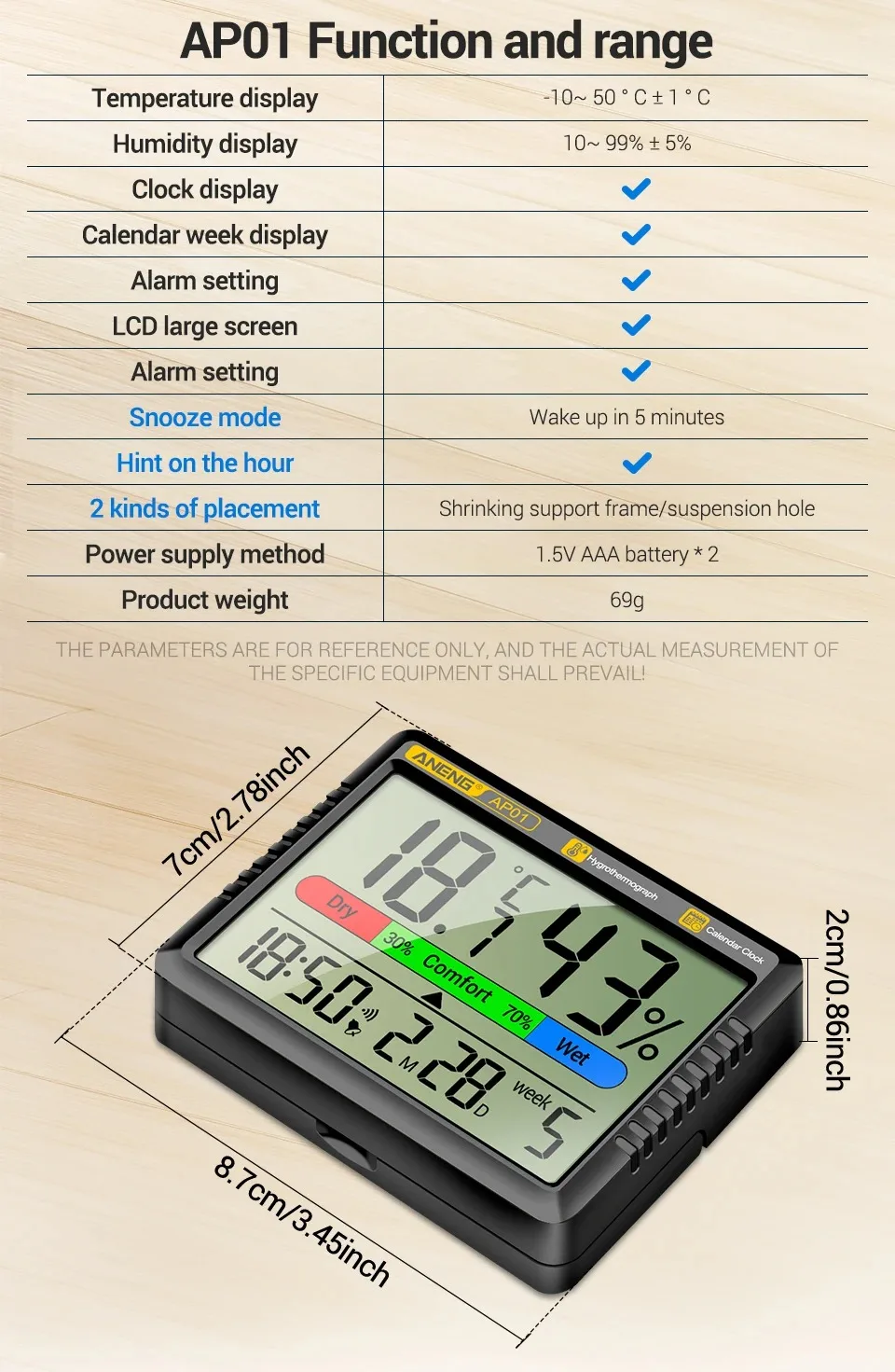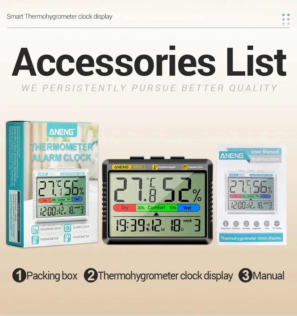 ANENG AP01 Digital Air Thermometer Hygrometer Desktop Alarm Clock Mini Table Thermohygrometer With High Definition Screen