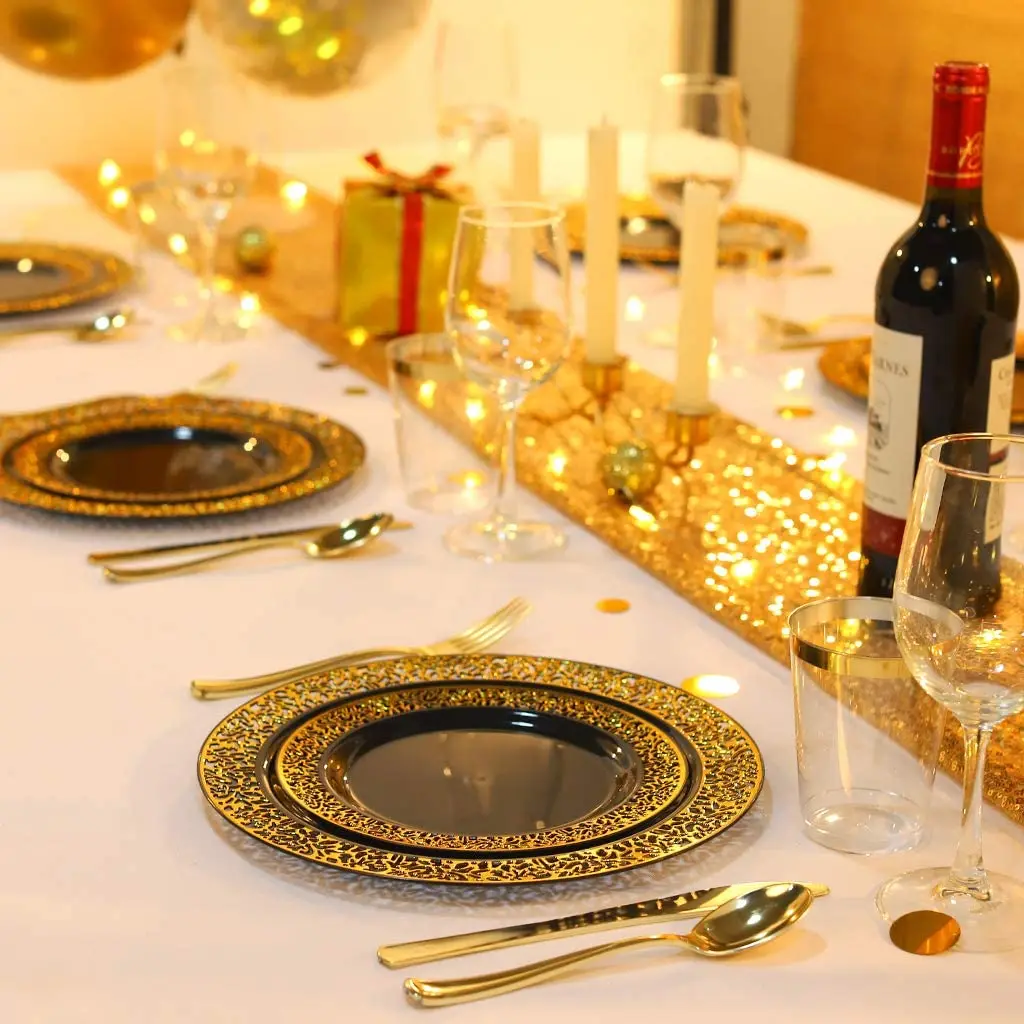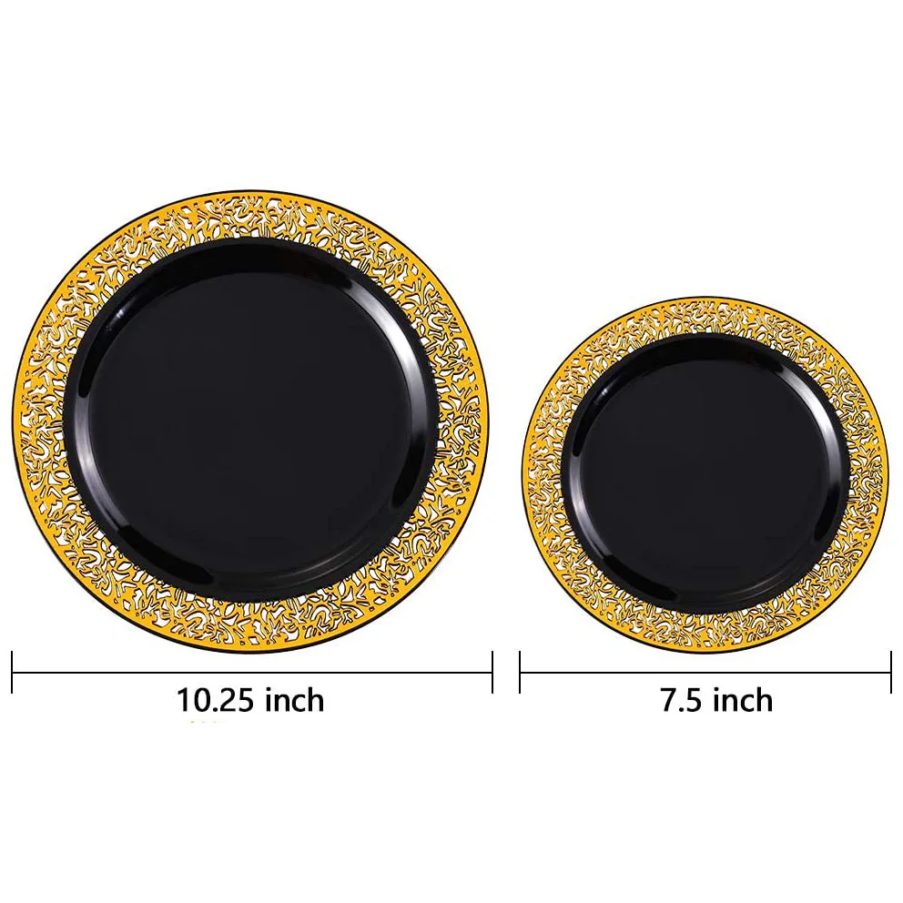 PLASTIC DINNERWARE:Each black with gold lace dinnerware includes 25pcs Plates,great for serving 25 Guests. No matter breakfast, lunch, or dinner ,these plastic party plates will fit all your needs.