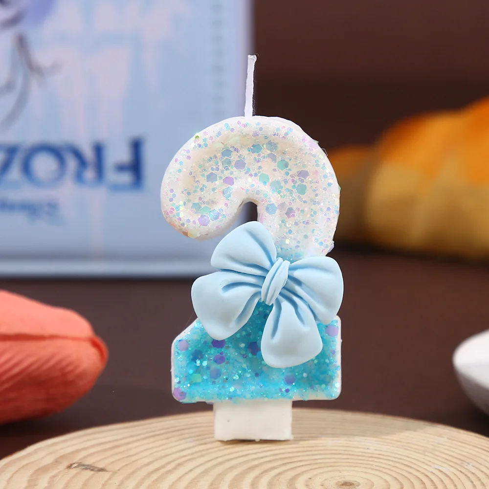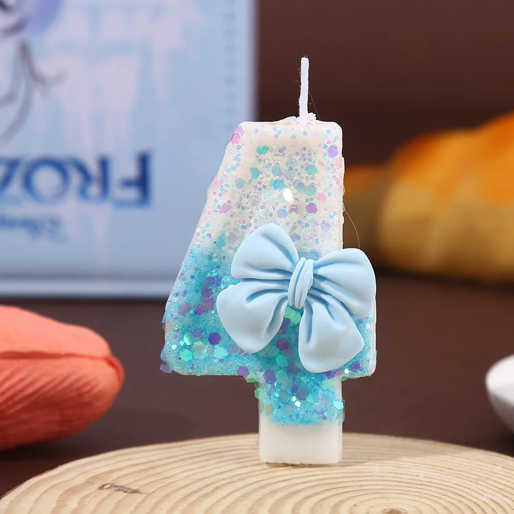 Blue and White Color Block Sequin Bow Digital Candle Birthday Party Cake Candle Creative Super Shiny Candle