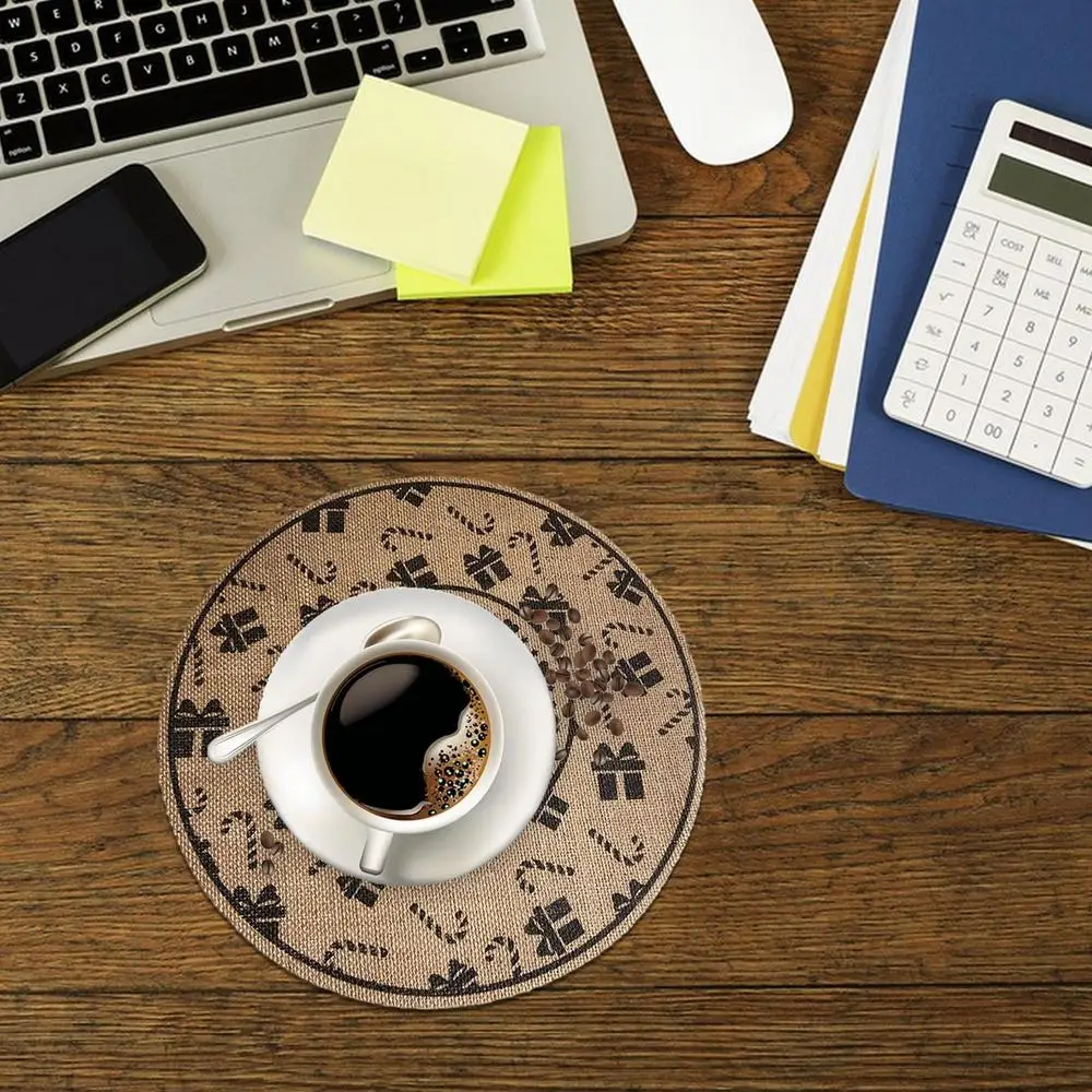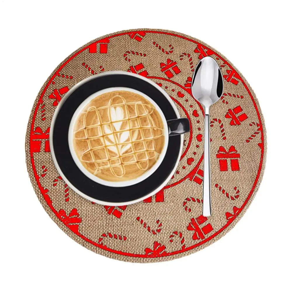 Enhance your holiday table setting with our elegant jute placemats. Featuring elaborate Christmas-themed prints, these sturdy mats offer heat insulation and prevent slipping. Designed for easy storage and portability, they are the perfect addition to any festive gathering