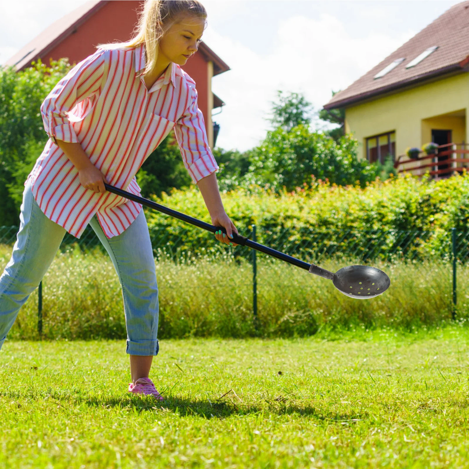 Description Designed for heavy-duty cleaning tasks, this round iron ladle is ideal for dredging and scooping. The perforated design allows for efficient drainage, making it suitable for cleaning out drains, removing mud, or sifting through soil. Its sturdy iron construction ensures it can withstand rigorous use, while the ergonomic handle offers a comfortable grip for prolonged tasks. garden rake