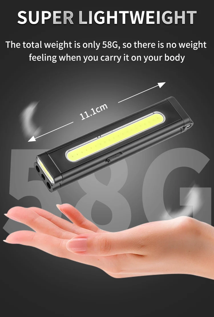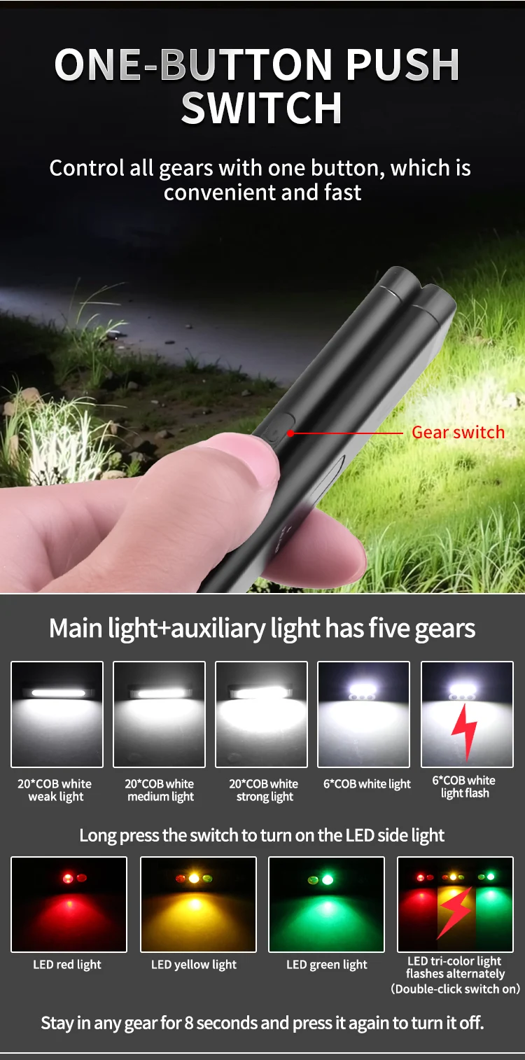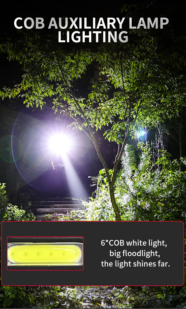 Stages: Stages (8 stages): Main light 20*COB white weak light - Main light 20*COB white medium light - Main light 20*COB white strong light - Auxiliary light 6*COB white light - Auxiliary light 6*COB white light fast flash - Long press switch to switch side light LED red light - LED yellow light - LED green light. Staying in any stage for 8 seconds and pressing again will turn off the device.
