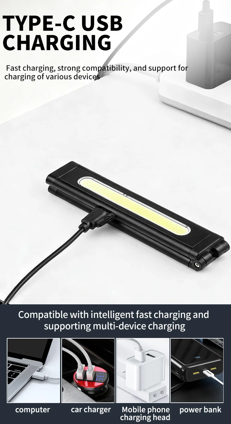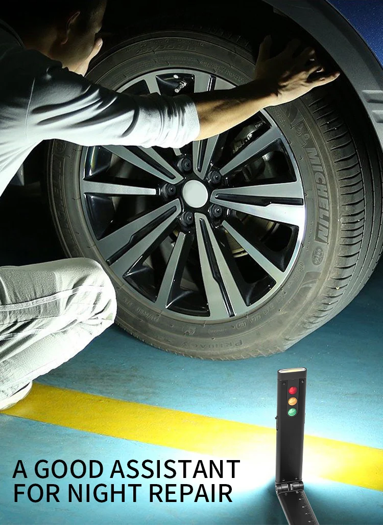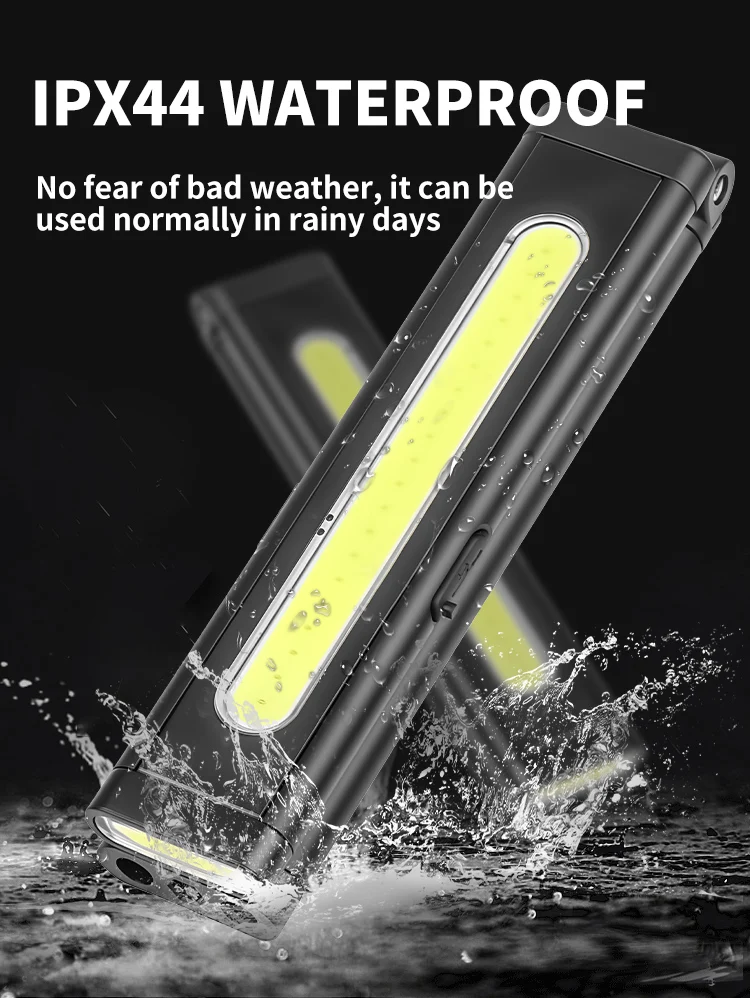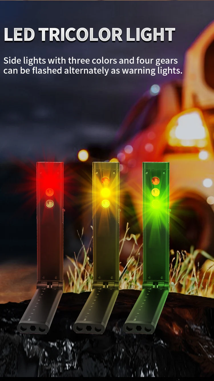 Stages: Stages (8 stages): Main light 20*COB white weak light - Main light 20*COB white medium light - Main light 20*COB white strong light - Auxiliary light 6*COB white light - Auxiliary light 6*COB white light fast flash - Long press switch to switch side light LED red light - LED yellow light - LED green light. Staying in any stage for 8 seconds and pressing again will turn off the device.